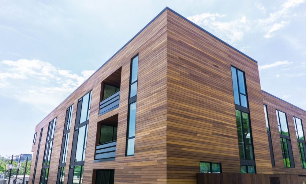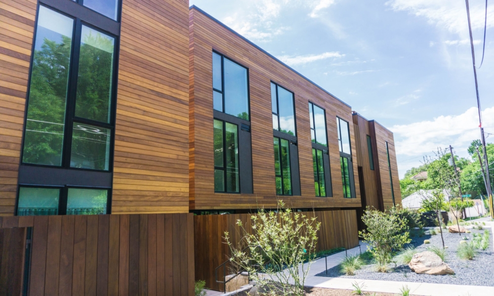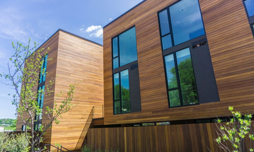 What does over 51,000 lineal feet of hardwood siding look like? It looks like the perfect finish to downtown Austin’s latest luxury urban living residence: 1010 W. 10. Situated on, you guessed it, 1010 West 10th St., the 3 story, 14 residence condo was developed by JB Cumby Construction and designed by Alterstudio. The entire complex was wrapped with a mix of 31,784 lf of Horizontal Garapa siding and 19,642 lf of Vertical Ipe Siding. Oiled before it was installed, the warm brown tones of the two tropical hardwoods surrounding the outside turn heads of those walking or driving by. The siding was custom-milled to a tex-gap profile: which has a tongue and groove to lock the boards in place while still giving the appearance of a shiplap siding. Choosing hardwoods like Garapa and Ipe ensure the stunning exterior architecture won’t be compromised by constant warping, cracking, or necessary staining. To learn more about 1010 W. 10, visit http://1010w10.com.
